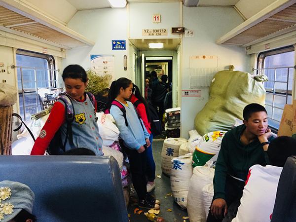 一天前的5634次列车上,适逢周五,又临近彝族年,彝族百姓采购大量过节食品,导致“慢火车”爆满,连车门旁都塞满了米、油、菜、水果等物品。过道上,不时有彝族百姓在卖水果、零食。