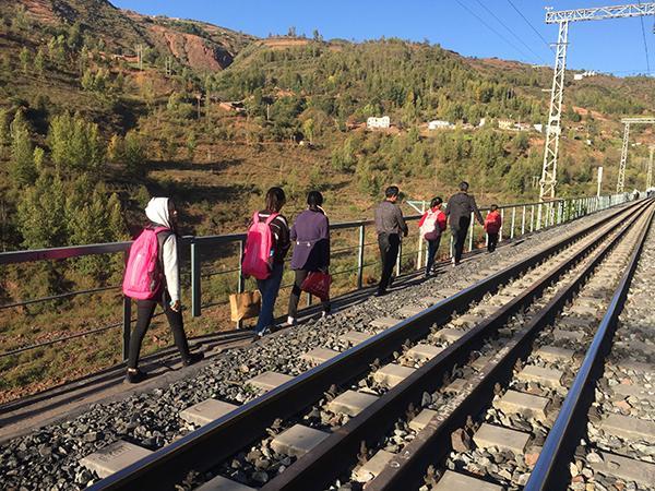 回家路上,一家人沿铁轨边的小路步行,用彝语聊家常。依火红敏表示,这样的回家路每周都在进行,没有任何特别之处,晚饭也不会特意加餐,但有时能吃到腊肉。