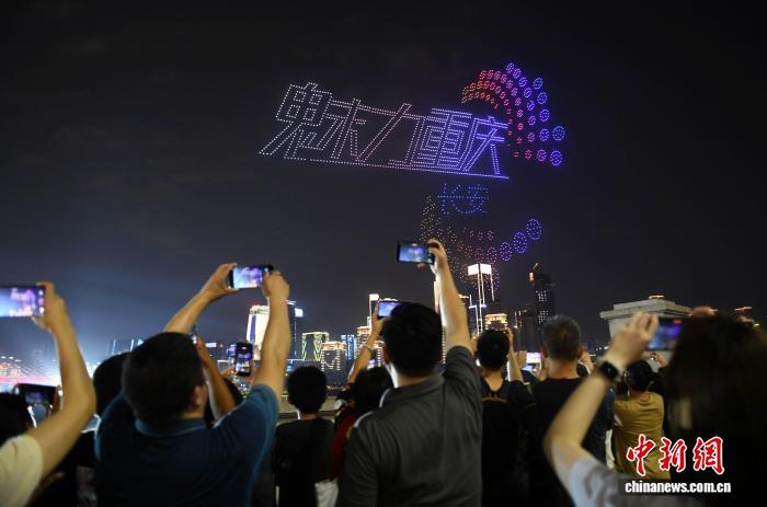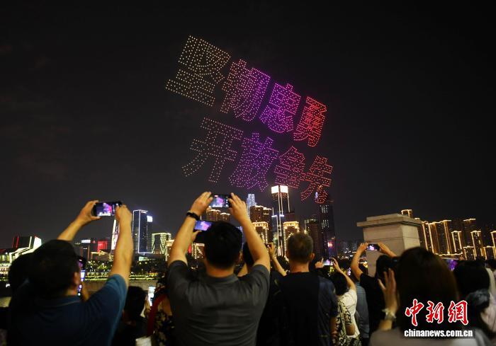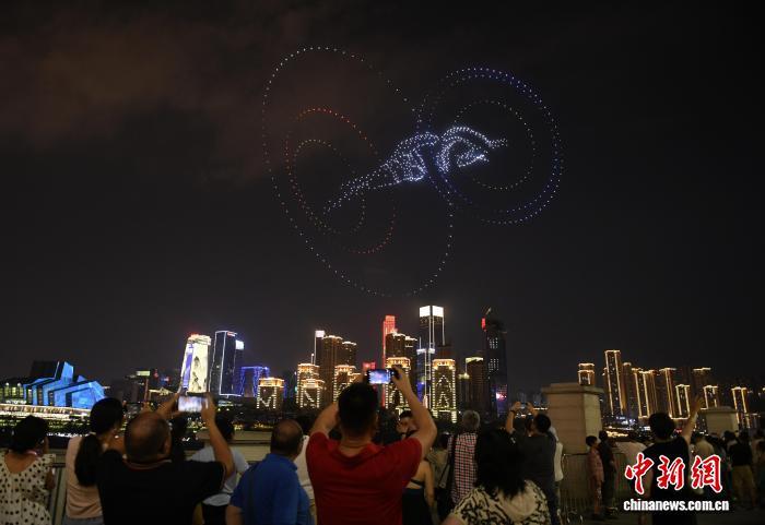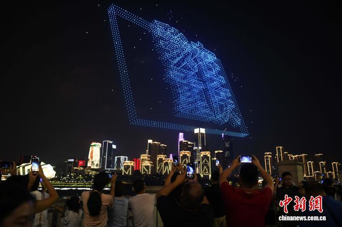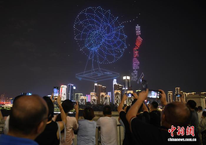 7月19日晚,“魅力重庆”无人机灯光秀点亮山城夜空,数千架无人机在重庆两江四岸核心区腾空而起,为民众献上一场科技与艺术的视觉盛宴。海外华文媒体在现场观看时,纷纷拿起手机、相机,记录灯光秀的精彩瞬间。据悉,19个国家和中国港澳台地区的26家华文媒体于本月16日来到重庆,参加“行走中国·2025海外华文媒体川渝行”联合参访活动,他们将在两周时间里,围绕“成渝地区双城经济圈建设”主题实地深入参访和集中报道。图为海外华文媒体与游客、当地民众一起欣赏无人机灯光秀。中新社记者 周毅 摄