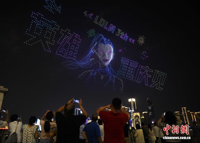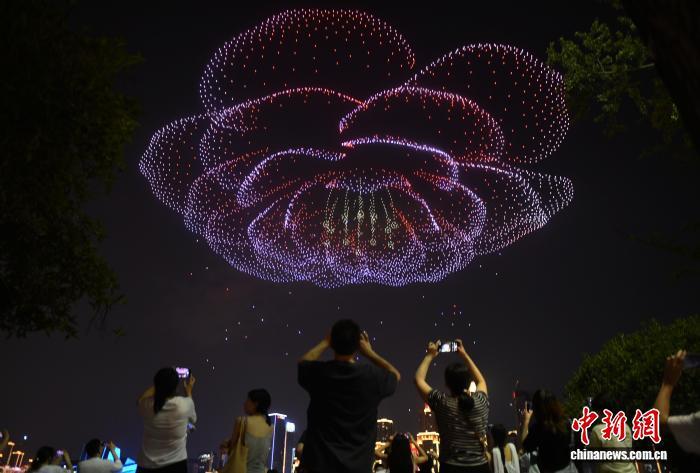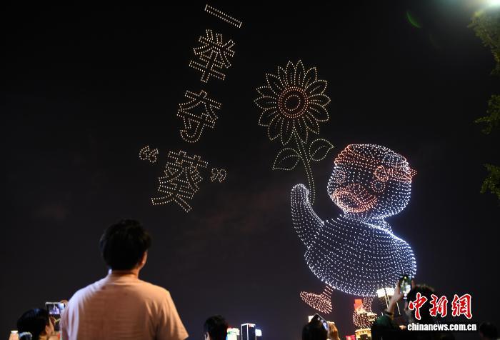 图为海外华文媒体与游客、当地民众一起欣赏无人机灯光秀。中新社记者 周毅 摄